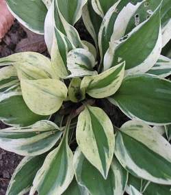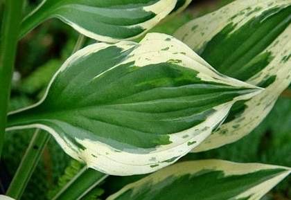 Хоста Lakeside Zinger (Лейксайд Зингер). Маленькая хоста. Высота 20 см. Диаметр 40 см. Листья длинные, заостренные, с неровной кремово-белой каймой, по которой разбросаны зеленые штрихи. Цветки лавандовые. Нарастает быстро.