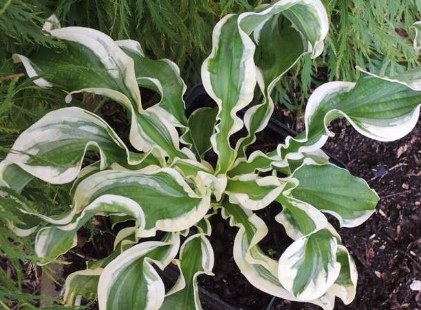 Хоста Let's Twist Again (Летс Твист Эгейн). Хоста среднего размера с необычными волнистыми и закрученными листьями. К тому же листья имеют белую кайму, что вкупе со спиралями и синусоидами линий создает ощущение залихватского танца. Цветки лавандовые. Лучше чувствует себя в полутенистом месте.