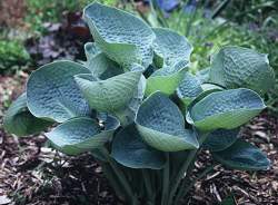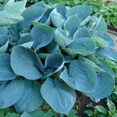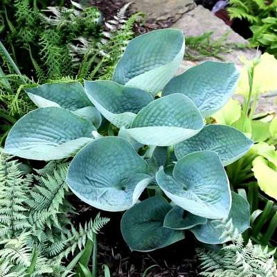 Хоста Love Pat (Лав Пэт). Высота растения 50 см, диаметр куста во взрослом состоянии 100 см. Листья голубые, округлые с плотной складчатой текстурой.