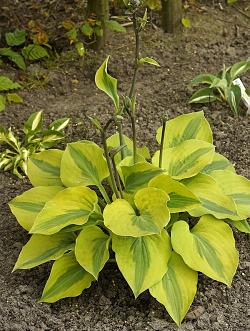 Хоста Luna Moth (Луна Маз). Средняя хоста. Листья зеленые с очень широкой желтой каймой. Спорт от сорта 'Parky's Prize'. Как и родительский сорт, разрастается очень быстро.