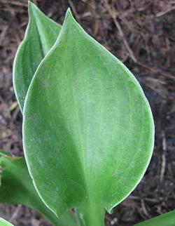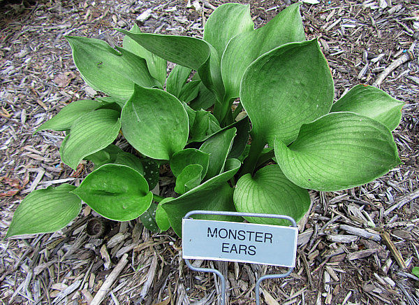 Хоста Monster Ears (Монстр Иэрс). Среднего размера хоста высотой 35 см и шириной 50 см. Листья 15 х 12 см, слегка закрученные, темно-зеленые с тонким светлым кантом, очень плотные. Цветёт в июле-августе бледно-лавандовыми цветками. Сорт устойчив к солнцу. Место солнечное или полутенистое. Почва влажная, дренированная. Зона 3 (до -34 °С).
