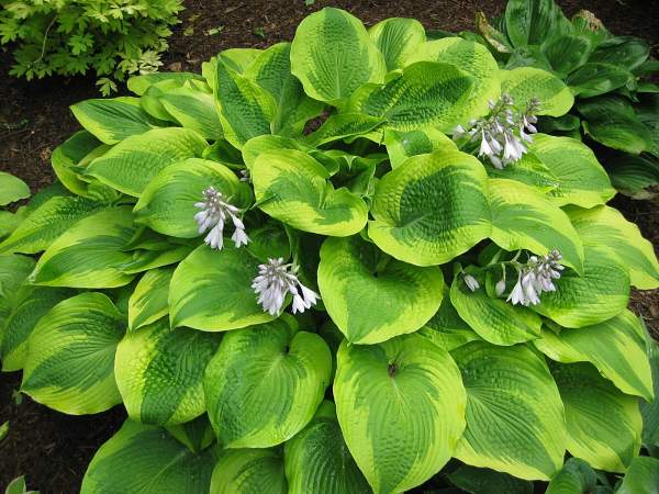 Хоста Moon Split (Мун Сплит). Вырастает до 50 см в высоту, это компактный по высоте, но раскидистый в ширину кустарник. Нежные оттенки листьев изменяются от желто-зеленого до темного. По форме листы овальные. После созревания на высоком цветоносе формируется белоснежное соцветие, источая неповторимый аромат и сохраняясь без увядания долгое время. Очаровательное растение станет отличным дополнением любого места во всем саду, в рабатках или бордюрах.