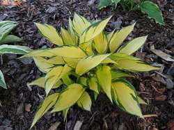 Хоста Orange Star (Оранж Стар). Среднего размера хоста высотой и шириной 40-50 см. Спорт сорта "June Fever". Листья очень толстые зеленовато-жёлтые с тёмно-зелёным краем. В лучах утреннего солнца центр листа излучает оранжевое свечение весной и кремовое — в конце лета. В тени листья будут жёлтые в течение сезона. Цветки бледно-лавандовые.