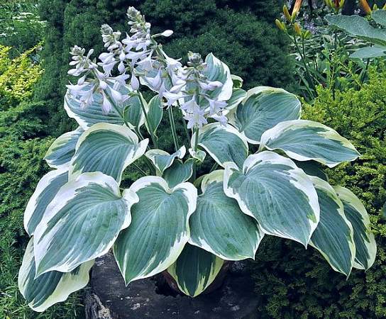 Соцветия сиреневые, без аромата. Рост достаточно медленный, что позволит постепенно вписывать хосту в цветник или другую интересную вам садовую композицию.