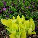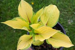 Paradise Island (Парадайз Айлэнд). Спорт от хосты Fire Island. Листья сердцеидные, ярко-желтые с темно-зеленым краем. Черешки красные. Красный цвет также очень красиво окрашивает центральную жилку у основания листа. Цветок лавандовый. Размер М (35-45 см). Место посадки полутень.