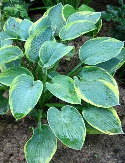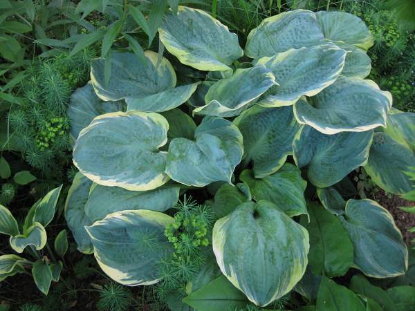 Хоста Pizzazz (Пиззаз). Высота куста 45 см, ширина 80 см, листья сердцевидные, плотные, жатые, голубовато-зеленые с кремовой каймой.