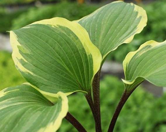 Хоста Proud Treasure (Прауд Треже). Размер медиум. Листья плотные и блестящие, слегка волнистые. Вначале темно-зеленые с желтой каймой, затем кайма белеет. Черешки и цветоносы пурпурного цвета. Цветки лавандовые, крупные. Цветет обильно. Высота цветоносов 85 см. Цветет с августе.