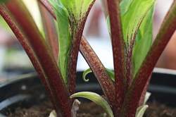 Высота растения 60 см, диаметр куста во взрослом состоянии 40 см. Листья пёстрые, яркие на высоких розово-красных черешках и красным штрихом по белому центру листа.