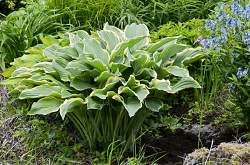 Хоста с вазообразной формой куста. Ширина 90 см. Высота 85 см. Листовая пластинка размером 28 x 17 см, плотная, матовая, серо-голубая, с неравномерной каймой от желтого до кремово-белого цвета с сероватыми полосами, край волнистый. Лист изогнутый, овальный, с острым кончиком. Растет быстро. Крупная эффектная хоста.