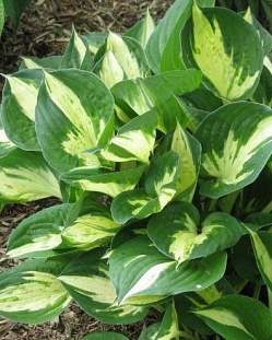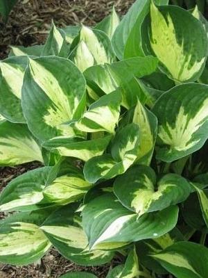 Хоста Revolution (Революшн). Растение до 50 см высотой. Листья сердцевидные, в центре кремово-белые, с зелеными полосками, край листа темно-зеленый. Штрихи в центре листа менее заметны весной, но усиливаются к середине лета. Цветы бледно-лавандовые.