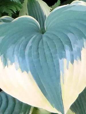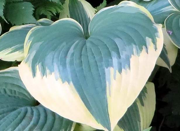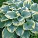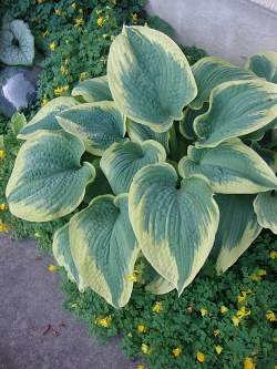 Хоста Robert Frost (Роберт Фрост). Листья округлые, темные, сине-зеленые с желто-кремовой каймой, которая становится почти белой в конце сезона. Цветет бледно-лиловыми цветами. Цветоносы высокие, до 90 см высотой. Сорт предпочитает тень или полутень.