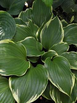 Хоста Secret Treasure (Секрет Треже). Красивые темно-зеленые глянцевые листья с желтой каймой, позже выгорающей до кремовой, почти белой, на бордовых черешках. Бордовый цвет заходит на лист. С возрастом край листа становится более волнистым. Цветы пурпурные. Быстрый рост.