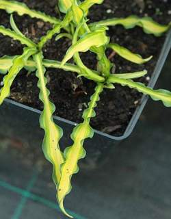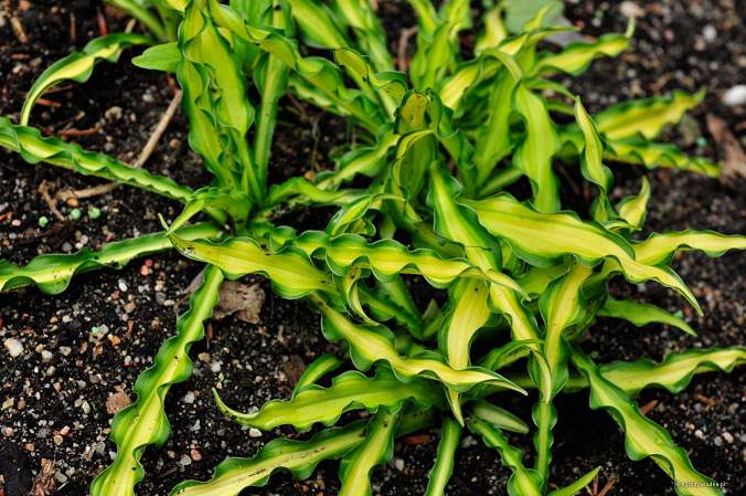 Хоста Sizzle (Сиззл). Очень длинные узкие ярко-желтые листья с интенсивной волной, которая продолжается от основания черешка до кончика листа. Зеленая кайма хорошо подчеркивает эту волну. Цветки лавандовые. Спорт от сеянца хосты Atom Smasher.