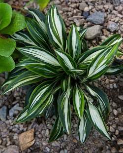 Хоста Sparkler (Спарклер). Маленькие узкие копьевидные листья. Трехцветная хоста, сочетание светло- и темно-зеленого цвета с белым. Листья плотные, слегка волнистые.