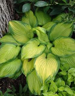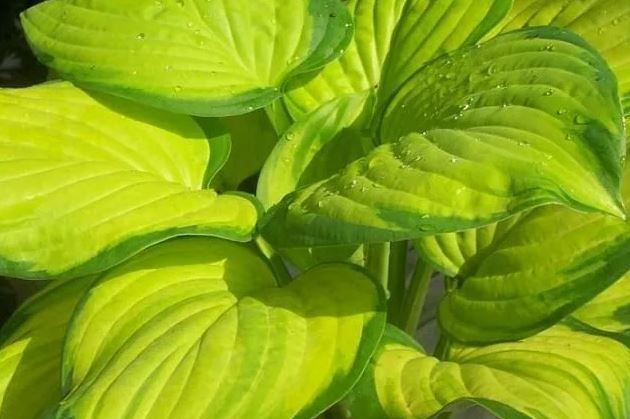 Хоста Stained Glass (Стейнд Гласс). Листья золотисто-жёлтые с неравномерной тёмно-зелёной каймой и слегка волнистым краем. Жилки чёткие. Цветки крупные, почти белые, ароматные. Быстро нарастает, образуя компактный куст красивой формы. Спорт хосты Guacamole. Хорошо растет на солнце.