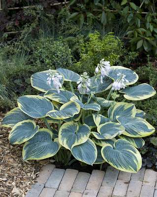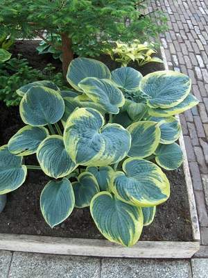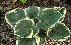 Хоста Sugar Daddy (Шуга Дадди). Мощный куст в виде большого плотного купола. Листья толстые, овальные сильно жатые и гофрированные. Сине-зеленый центр листа окаймлен желтовато-белой каймой. Этот сорт хорошо растет в полутени и тени. Устойчива к повреждению улитками и слизнями.