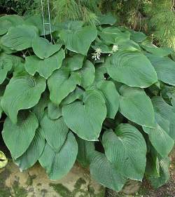 Хоста T Rex (Ти Рекс). Большие листья ярко-зеленого цвета с редкими прожилками и cердцевидной формой придают хосте свой неотразимый шарм. Высота растения больше 70 см. Цветки светло-сиреневые.
