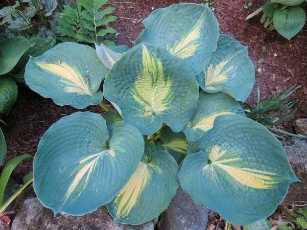 Хоста Thunderbolt (Сандерболт). Крупная хоста с роскошной розеткой. Черешки желтые, толстые. Листья большие, сердцелистные, бархатно-голубовато-зеленые, по центру желтая молния. Растет как на солнце, так и в тени. Цветки крупные, белые, цветонос светло-бежевый. Сорт великолепный, очень стойкий, не поражается слизнями.