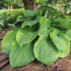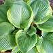 Зелёные блестящие листья с широкой золотистой каймой, цветы лавандовые. Одна из самых больших хост с размером куста 150х100 см.