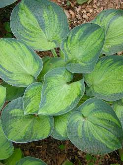 Хоста Tokudama Aureonebulosa (Токудама Ауреонебулоза). Листья чашеобразной формы, выразительной "вафельной" фактуры, плотные, золотисто-жёлтые в середине и покрытые сизым налётом, с перьевидным сине-зелёным окаймлением, заходящим полосами на центральную часть. Цветы практически белые. Очень красивый и сильный сорт, но разрастается медленно. Лучшее место посадки — полутень.