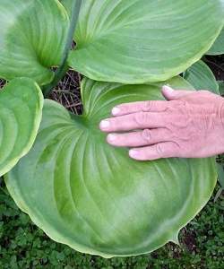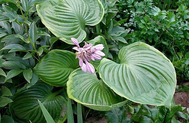 Хоста UFO (ЮФО). Гигантская хоста с необычной формой листьев. Листья огромные, круглые, глянцевые, чашевидной формы. По краю листа тонкая кремово-желтая кайма. Цветки лавандовые. Высота до 120 см.
