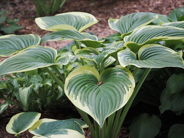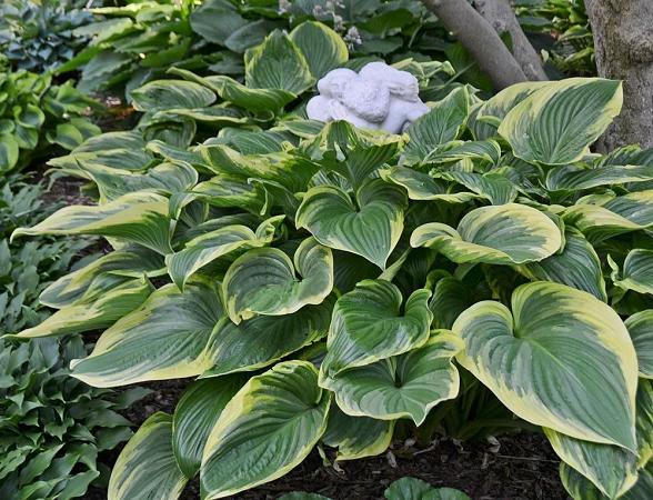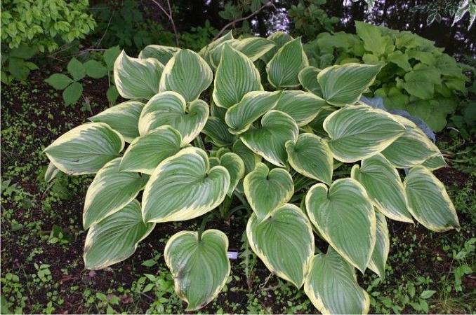 Хоста Victory (Виктори). Хоста — шедевр. Благодаря крупным блестящим листьям, достаточно высоким темпам роста, теневыносливости и способности хорошо сочетаться со многими многолетними растениями интересует как садоводов-любителей так и профессиональных ландшафтных дизайнеров. Образует большие, сердцевидной формы блестящие ярко-зеленые листья с желтоватыми краями, которые к концу лета становятся кремово-белыми. Цветет достаточно крупными лавандово-белыми цветами на высоких цветоносах. Благородная форма и окраска листьев, прекрасный вальяжно-раскидистый куст, эта хоста действительно станет украшением сада.