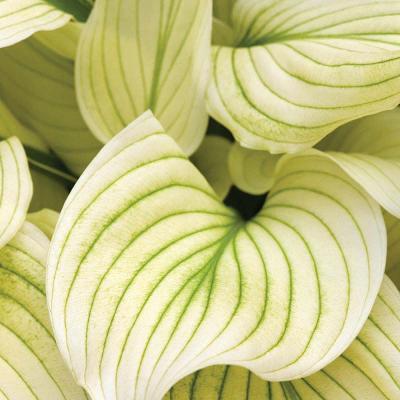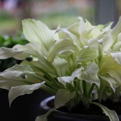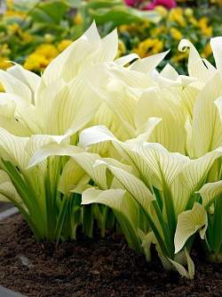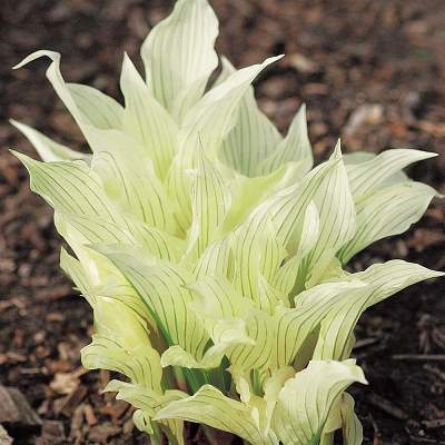 Хоста White Feather (Вайт Фезер). Высота растения 30 см, диаметр куста во взрослом состоянии 65 см. Листья узкие, волнистые, белые весной, затем меняются на зелёные с белыми полосами.