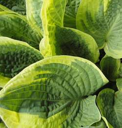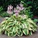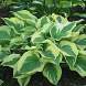 Хоста Wide Brim (Уайд Брим). Сорт с красивой сердцевидной формой листа. Оливково-зеленые морщинистые листья обрамлены широкой кремово-золотистой каймой. Очень устойчива к повреждению улитками и слизнями, зимостойка. Цветки бледно-лавандовые, ароматные, цветение обильное. Быстро разрастается.