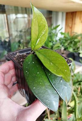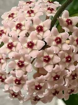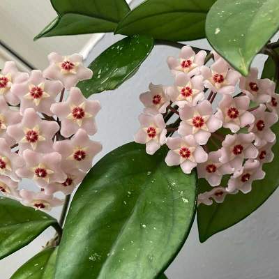 Хойя карноза (Восковой плющ). Красивое ампельное растение с жесткими блестящими листьями. Обычно гибким побегам позволяют либо свободно ниспадать (подвесное кашпо, высокая полка), либо сворачивают кольцом на опоре. Соцветия состоят из белых или розоватых звездчатых цветков с темно-розовой "пуговкой" в центре. Растет при любой экспозиции (юг, восток, север, запад). Полив после почти полного просыхания почвы. Хойя неприхотлива.