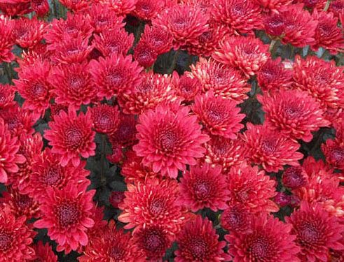 Хризантема Skyfall Red (Скайфол Ред). Очаровательная ампельная хризантема, если вовремя прищипывать свежие побеги, образует огромный цветочный шар. Цветки темно-красные, махровые, помпонные. Цветение обильное с августа по октябрь. Высота куста 50 см.