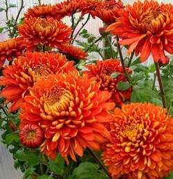 Хризантема Аврора. Морозостойкий сорт, не требующий укрытия на зиму. Высота куста 70 см. Стебли прямые, разветвленные. Соцветия махровые, 10 см в диаметре, лепестки оранжево-красные с светлой подкладкой. Цветет в августе-октябре. При посадке растения важно не заглублять. Хризантема любит влажные дренируемые почвы. Лучшая погода для высадки рассады пасмурная.
