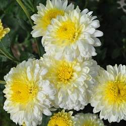 Хризантема средней высоты, 60-80 см. Корзинки довольно крупные, 6-8 см, идеальной формы в виде помпончика. В центре желтые, по краю белые. Устойчивый и популярный сорт. Хорошо растет в садах средней полосы России.