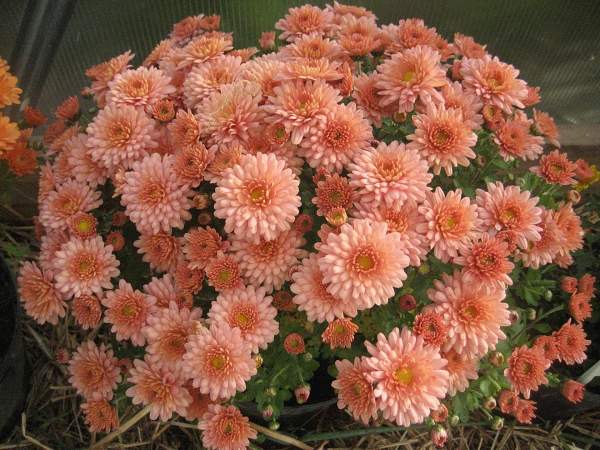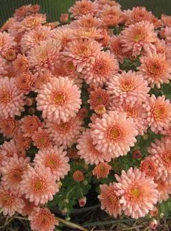 Хризантема Branbeach Salmon (Бранбич Сэлмон). Шаровидный куст высотой 40 см. Побеги крепкие, сильно ветвящиеся. Во время цветения куст полностью покрыт цветками лососевого цвета. Диаметр цветков 4 см. Окраска нежная, меняется в процессе цветения.