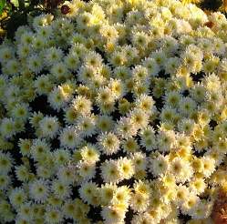 Хризантема мультифлора Чудное Мгновение. Ровный, плотно набитый шар правильной формы. Цветки — махровые "ромашки", имеющие в начале роспуска один оттенок, по мере раскрытия становятся белыми с желтоватой серединкой. Цветет с сентября до заморозков.