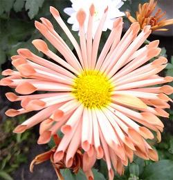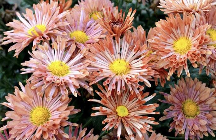 Хризантема Деко. Морозостойкий сорт, не требующий укрытия на зиму. Высота куста 50 см. Стебли прямые, разветвленные. Соцветия очень красивые, язычковые цветки необычного розовато-бежевого цвета, свернуты в трубочки. Диаметр соцветий 6 см. Цветет в августе-октябре. При посадке растения важно не заглублять. Хризантема любит влажные дренируемые почвы. Лучшая погода для высадки рассады пасмурная.