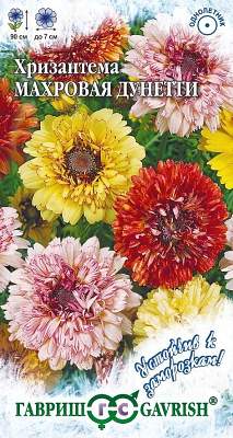 Хризантема Дунетти (махровая). Однолетние прямостоячие густоветвистые растения высотой 90 см. Соцветия махровые, душистые крупные, до 7 см в диаметре, одиночные или собраны по 2-10 на боковых ветвях, раскрываются в разное время. Стебель мясистый, листья дважды перисто-раздельные. Цветут с конца июня до заморозков. Растения светолюбивы и холодостойки, достаточно засухоустойчивы. Предпочитают легкие плодородные почвы с добавлением извести. При выращивании через рассаду семена высевают в ящики в апреле, поверхностно, не заделывая, прямой посев в грунт возможен в начале мая.