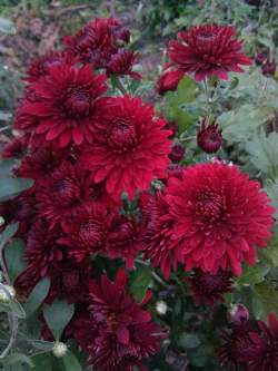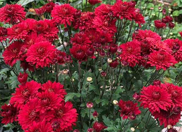 Хризантема корейская Калина Красная. Морозостойкий сорт, не требующий укрытия в средней полосе. Куст довольно высокий, до 60 см. Цветки 7-8 см в диаметре, ярко рубиновые. Цветет с августа по октябрь.