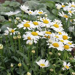 Карликовое растение высотой 20-30 см, очень кустистое с огромным количеством крупных, до 5 см ромашек. Практически это очень симпатичная низкорослая ромашка (нивянник). Цветёт обильно и долго.