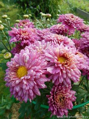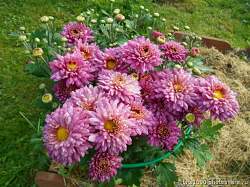 Хризантема Карнавал. Красивые темно-розовые корзинки с желтой "пуговкой". Цветок темно-розовый, махровый, когда раскрывается, становится видна желтая корзинка. Высота куста 40-50 см. Цветение в сентябре.