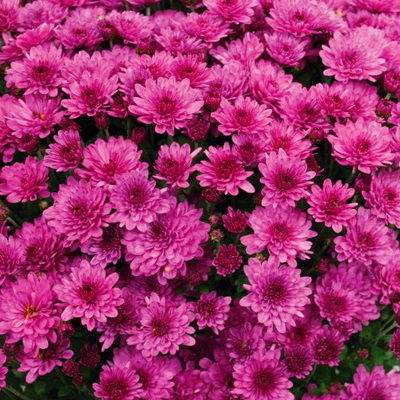 Хризантема мультифлора Bransound Purple (Брансаунд Пёпл). Chrysanthemum multiflora относится к новой линии бордюрных супернизкорослых хризантем. Такие цветущие растения не нуждаются в опорах, подвязывании и любых дополнительных условиях для формирования кустов. Хризантемы самостоятельно формируются в шарообразные кусты, которые усыпаны цветами. Листва за цветами почти не видна.