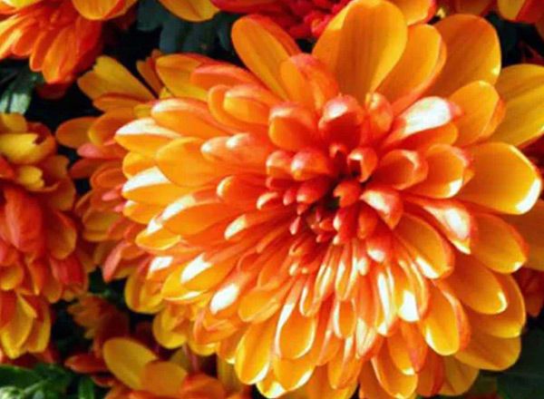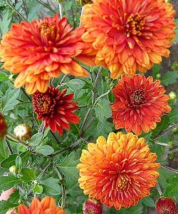 Хризантема Огниво. Соцветия густомахровые. Цветение обильное и продолжительное. Пик цветения — в сентябре. Зимует в открытом грунте. Легко размножается. Высота 70 см.
