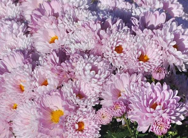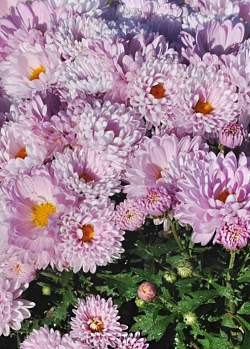 Хризантема Перламутровая. Морозостойкий сорт, не требующий укрытия на зиму. Высота куст 45-50 см. Стебли прямые, разветвленные. Соцветия шарообразные, пушистые, пышные, переливчатой окраски, от бледно до ярко-розового цвета. Цветет продолжительно с сентября по ноябрь. При посадке растения важно не заглублять. Хризантема любит влажные дренируемые почвы. Лучшая погода для высадки рассады пасмурная.