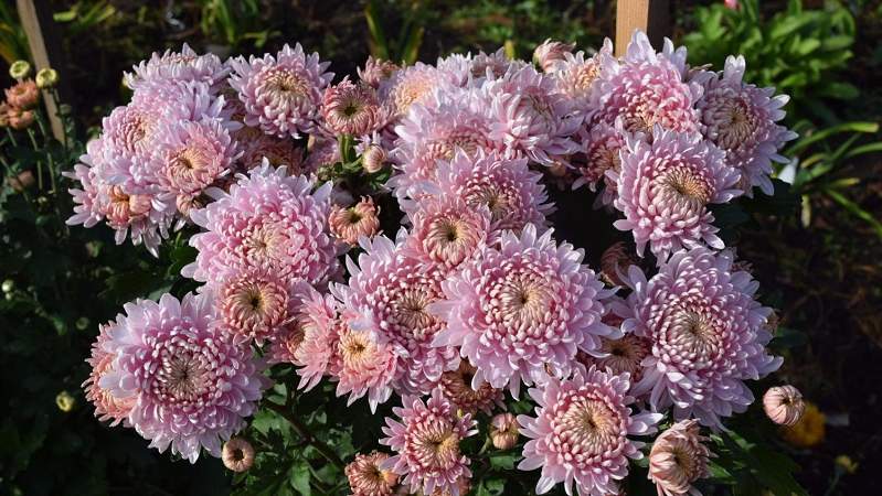 Хризантема Розовый Сон. Морозостойкий сорт, не требующий укрытия на зиму. Высота куста 65 см. Стебли прямые, разветвленные. Соцветия махровые, розовые, крупные (до 10 см в диаметре). Цветет в августе-октябре. При посадке растения важно не заглублять. Хризантема любит влажные дренируемые почвы. Лучшая погода для высадки рассады пасмурная.