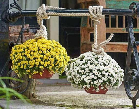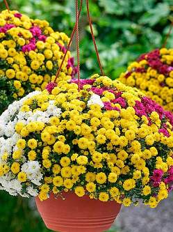 Хризантема Skyfall Yellow (Скайфол Еллоу). Очаровательная ампельная хризантема, если вовремя прищипывать свежие побеги, образует огромный цветочный шар. Цветки желтые, махровые, помпонные. Цветение обильное с августа по октябрь. Высота куста 50 см.