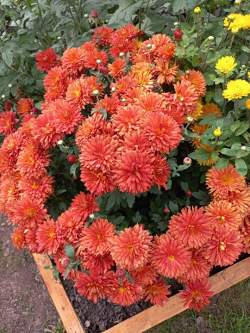 Хризантема корейская Ватра. Морозостойкий сорт, не требующий укрытия на зиму. Цветки кораллово-красные, махровые. Цветение обильное с августа по октябрь. Высота куста 50 см.