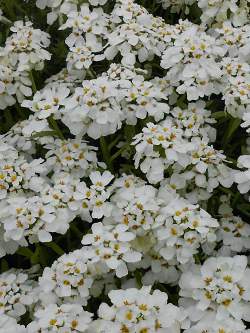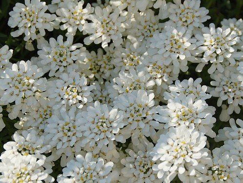 Иберис Schneeflocke (Шнеефлок). Вечнозеленое низкорослое растение. Высотой до 30 см, листья мелкие (длиной до 7 см), продолговатые, цельнокрайние, темно-зеленые, блестящие. Цветки мелкие, белые, собраны в зонтиковидное соцветие диаметром до 5 см; цветет в мае-июне. Светолюбив, выносит легкое затенение.