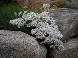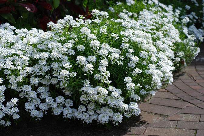 Иберис вечнозеленый. Полукустарничковое вечнозелёное растение семейства Крестоцветных с тёмно-зелёными узкими листьями. Цветки в плотных верхушечных зонтиках в мае-июне. Почва требуется любая садовая. Посадка на солнце или в полутени. Цветки белые, зонтиковидные соцветия обильно покрывают весь куст в начале лета. Размеры куста 12-15 см высота, 30-60 см ширина.