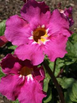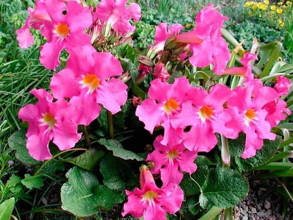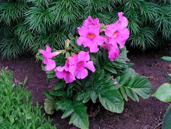 Инкарвиллея Делавея. Инкарвиллея имеет и другое, более привычное название — садовая глоксиния. Отличается листьями перистой формы, цветки могут иметь темно-розовый ил светло-розовый оттенок. Для всех видов инкарвиллеи характерно длительное цветение: новые бутоны могут появляться 6-7 недель подряд, то есть практически все лето. В некоторых случаях они могут второй раз зацветать в самом начале осени, если растение обеспечено всем необходимым для хорошего роста.