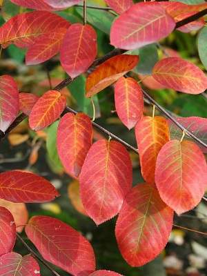 Ирга канадская Балерина. Высокий кустарник или небольшое дерево, высотой до 8 м, шириной до 6 м. Чисто белые цветки в форме звезды, крупные, диаметром 2,5 — 3 см, собранные в кистевидные соцветия длиной 7 — 10 см, появляются в мае. Красные, зрелые — тёмно-красные и чёрные, диаметром 1 — 1,25 см, сочные и сладкие съедобные ягоды появляются в начале июля.