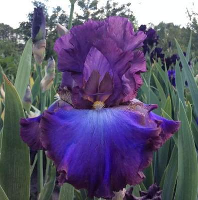 Ирис высокий бородатый Afternoon In Rio (Афтенун Ин Рио). Стандарты пурпурно-фиолетовые, фолы темно-фиолетовые с синим и пурпурным. Края бронзовые. Около бородки светлое пятно. Бородка золотая. Красивая гофрировка. Высота 91 см.